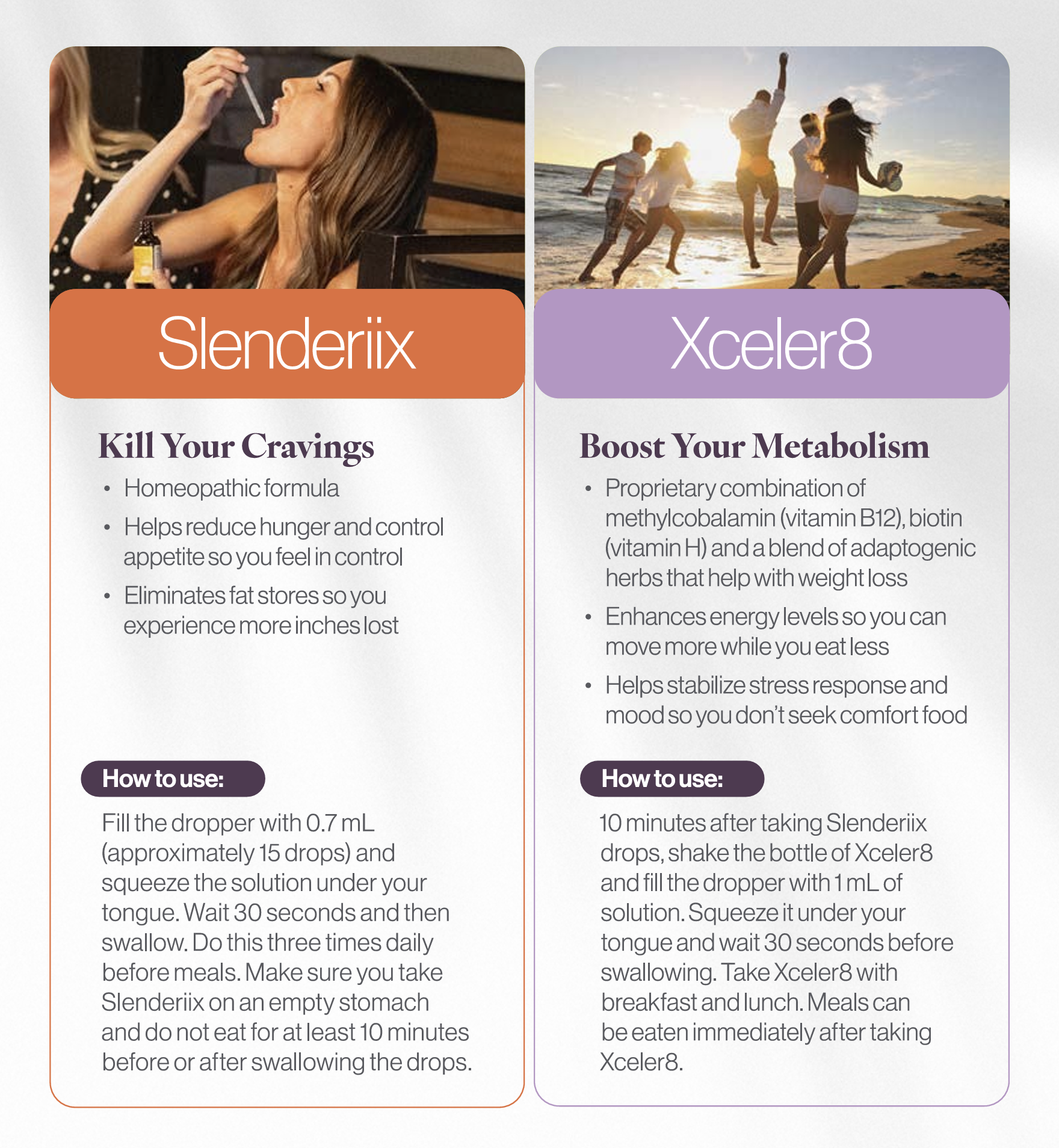 Our commitment to wellness means partnering with brands that share the same high standards for health and results. The innovative Slenderiiz® Weight Loss System by Partner Co—a safe, effective, and proven way to support weight management, seamlessly aligned with our philosophy. With Slenderiix™ & Xceler8™ drops, users gain a science-backed and convenient edge to achieving weight loss goals while maintaining a natural and balanced lifestyle.